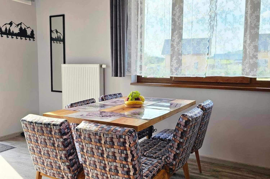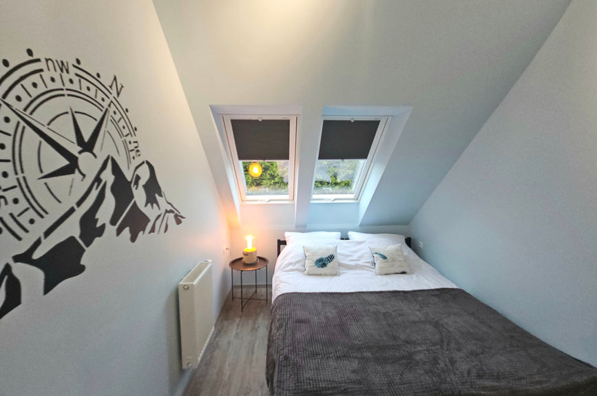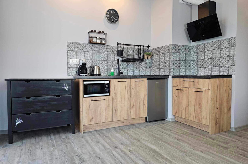 Każdy pokój został zaprojektowany z myślą o komforcie i wygodzie Gości. Do dyspozycji jest osobna sypialnia oraz aneks kuchenny z pełnym wyposażeniem — sztućcami, naczyniami, ekspresem do kawy, płytą indukcyjną, kuchenką mikrofalową i lodówką. W łazience znajduje się prysznic, a na Gości czekają świeże ręczniki oraz dozownik z mydłem. W salonie można zrelaksować się przy telewizorze SmartTV, w otoczeniu wyjątkowych detali, takich jak meble odnowione własnoręcznie przez właścicieli obiektu oraz oryginalne obrazy ich autorstwa, które nadają wnętrzom niepowtarzalny charakter.